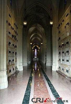4. 杰克逊的灵柩被安放在墓穴中,墓穴两侧摆放着鲜花和蜡烛。